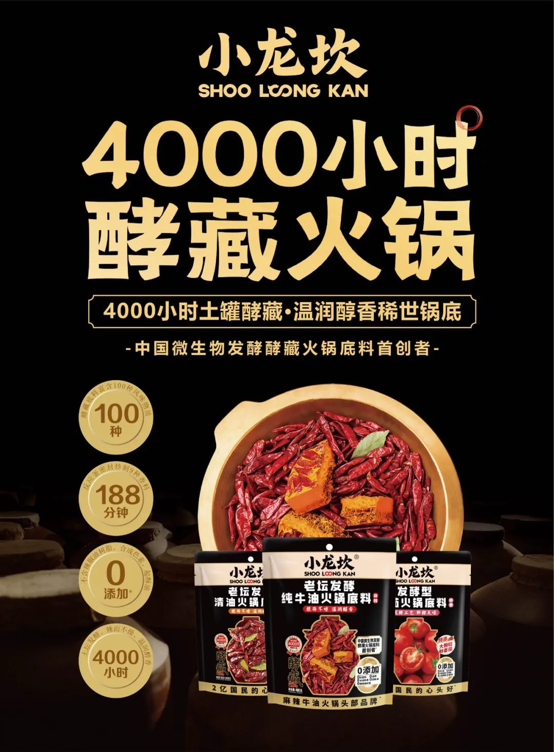 小龙坎新品火锅底料严格遵循“天然原料,多重0添加”准则,坚持不添加防腐剂、人工香精及化学调味剂,通过微生物发酵的自然力量,将原料的鲜、香、麻、辣层层释放,打造出层次丰富的味觉盛宴。该工艺获得沙利文认证:中国微生物发酵酵藏火锅底料首创者。4000小时酵藏发酵工艺有效降低底料燥热属性,让消费者纵享火锅酣畅淋漓的同时,真正践行“健康火锅”的消费升级趋势。
